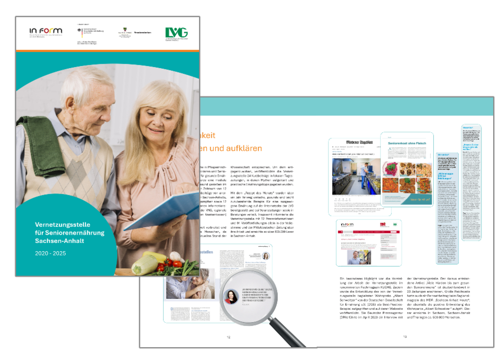 Im Rahmen des Projekts „Vernetzungsstelle für Seniorenernährung“ war ich verantwortlich für die kreative Gestaltung und Umsetzung einer umfassenden Projektdokumentation. Diese entstand unter Einsatz von Adobe InDesign sowie weiteren Adobe-Tools und wurde in enger Abstimmung mit den Förderinstitutionen des Bundes und des Landes realisiert.