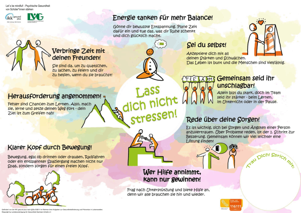 • Informationsmaterial für Schüler, das aufzeigt, an wen sie sich wenden können, wenn sie gemobbt werden oder psychische Probleme haben.